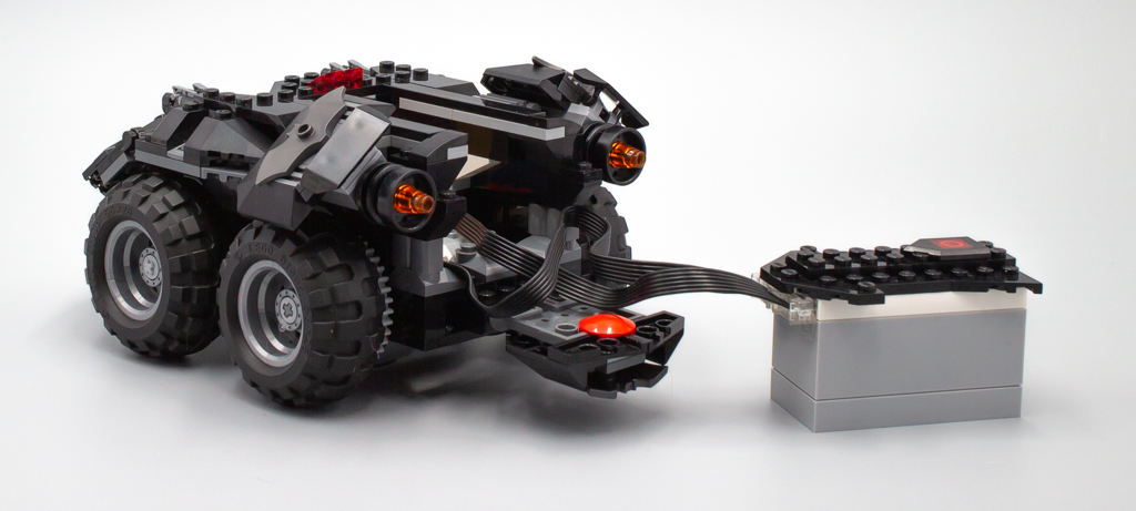LEGO a apparemment décidé de proposer un engin motorisé et a ensuite essayé d'habiller le châssis, les quatre grosses roues et le hub Powered Up intégrés pour transformer la chose en Batmobile. Le résultat est à mon avis très décevant sur le plan purement esthétique. J'ai cherché un peu mais je n'ai pas trouvé de Batmobile qui ressemble même vaguement à cet engin. Il ne s'agit pas non plus d'une reproduction au format Chibi de quelque chose d'existant dans l'univers du justicier de Gotham City.