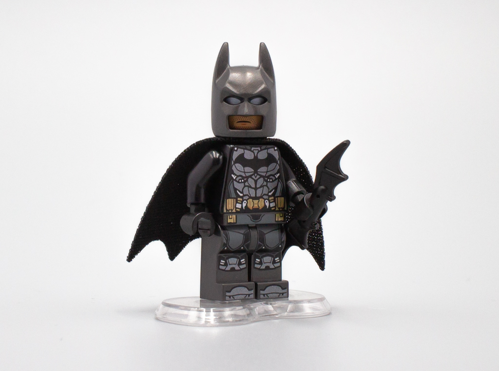 Comme je le disais plus haut, la minifig livrée est (pour l'instant) exclusive à cette boite. Le costume de Batman est celui vu dans le jeu vidéo Arkham Knight avec un torse noir et des jambes en Pearl Dark Gray. Le masque est également en Pearl Dark Gray (ou Titanium Metallic) comme dans le set 76044 Clash of the Heroes commercialisé en 2016. Le support transparent ci-dessous n'est pas fourni.