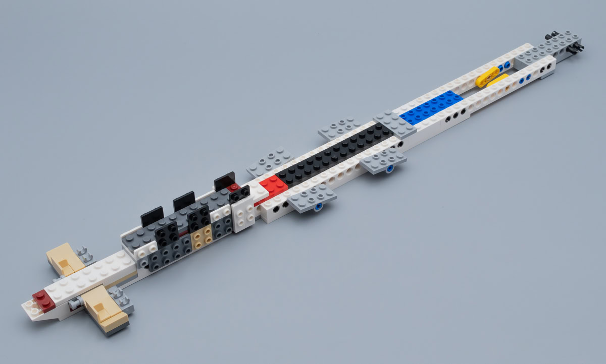 L'assemblage est plaisant, avec l'incontournable armature centrale à base de pièces Technic qui s'élargit à l'arrière en forme de T pour accueillir les moteurs et assurer à ces derniers une solidité sans faille, quelques briques de couleur pour agrémenter un inventaire qui s'annonce plutôt monotone et quelques phases un peu répétitives, notamment au niveau des 11 moteurs, mais qui ne viennent pas gâcher "l'expérience" comme LEGO se plait à appeler le processus de construction. On comprend très vite que la poignée prévue sera très utile : il est très vite difficile de trouver comment attraper la construction en cours sans perdre quelques pièces au passage.