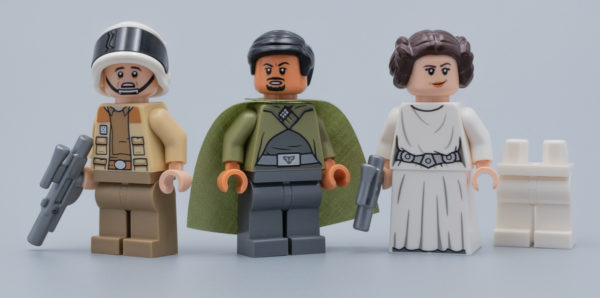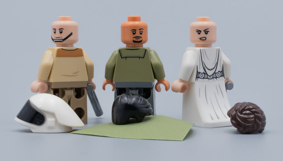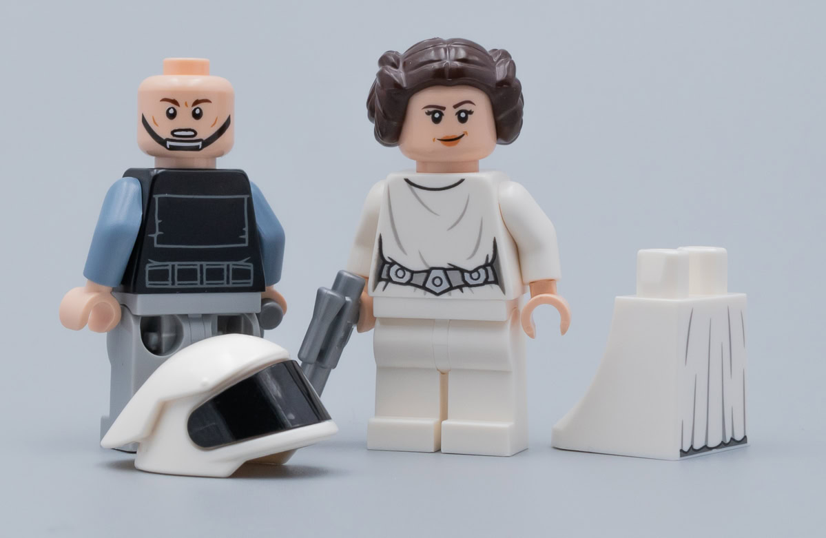 Leia est de son côté équipée du torse avec capuche dans le dos déjà vu dans les sets 75159 UCS Death Star (2016) et 75229 Death Star Escape (2019) et la minifig est livrée avec une paire de jambes blanches et une tunique inédite qui permet d'obtenir une figurine vraiment cohérente.