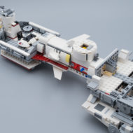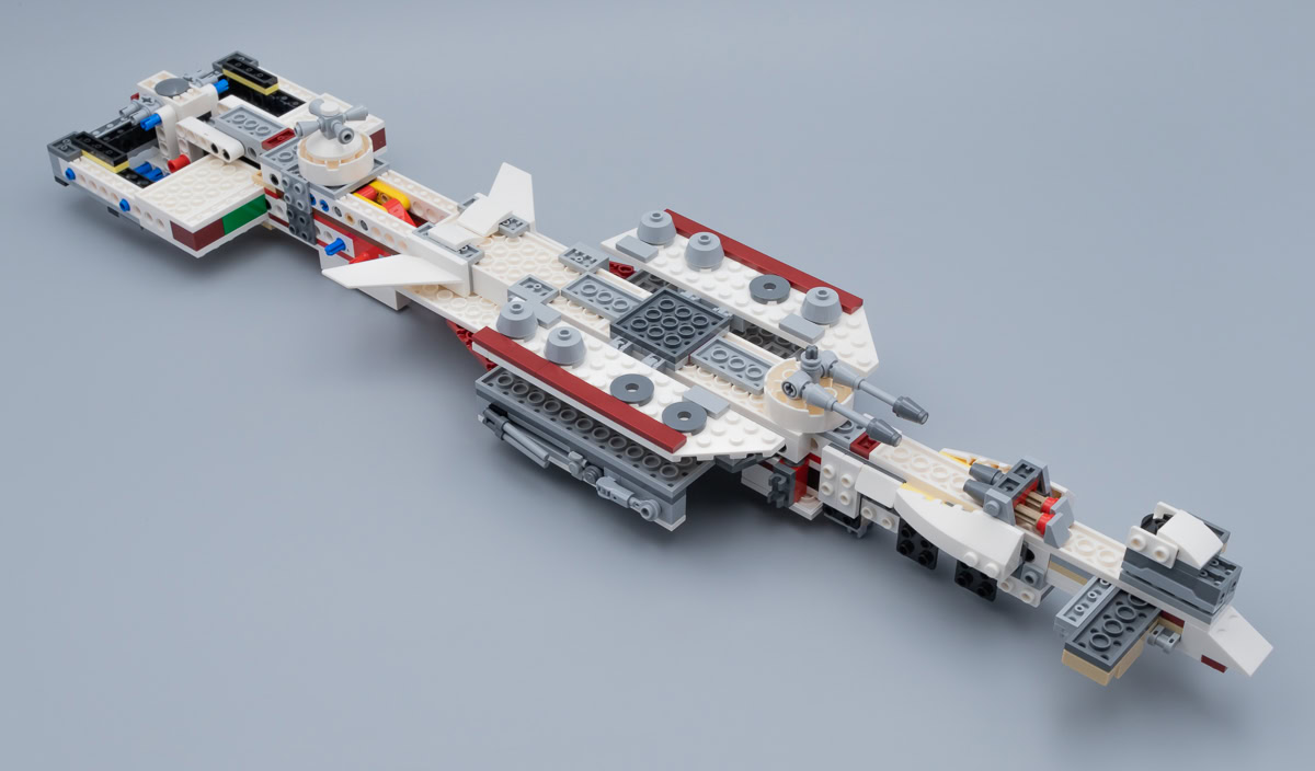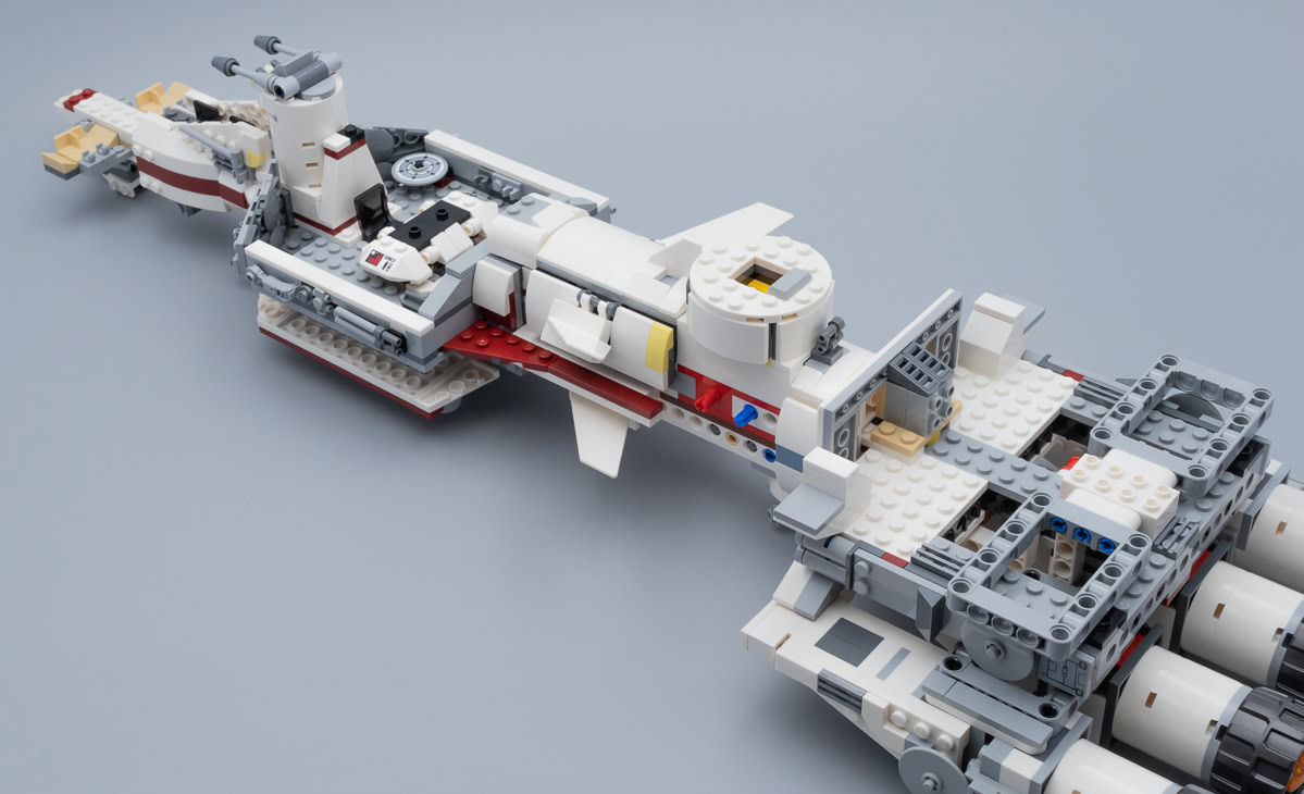 Comme d'habitude avec les playsets LEGO, les différents espace prévus pour y faire vivre des aventures palpitantes à nos minifigs sont très exigus. Quelques chaises, un peu d'espace autour et voilà. Le vaisseau est plutôt bien doté en espaces "jouables" avec deux capsules de sauvetage dans lesquelles deux personnages peuvent prendre place, une soute à missiles pour y ranger les deux munitions fournies en plus de celles déjà en place dans leurs canons respectifs, deux postes de pilotage avec sièges pour minifigs et un grand espace central avec table de conférence et console de commande.
