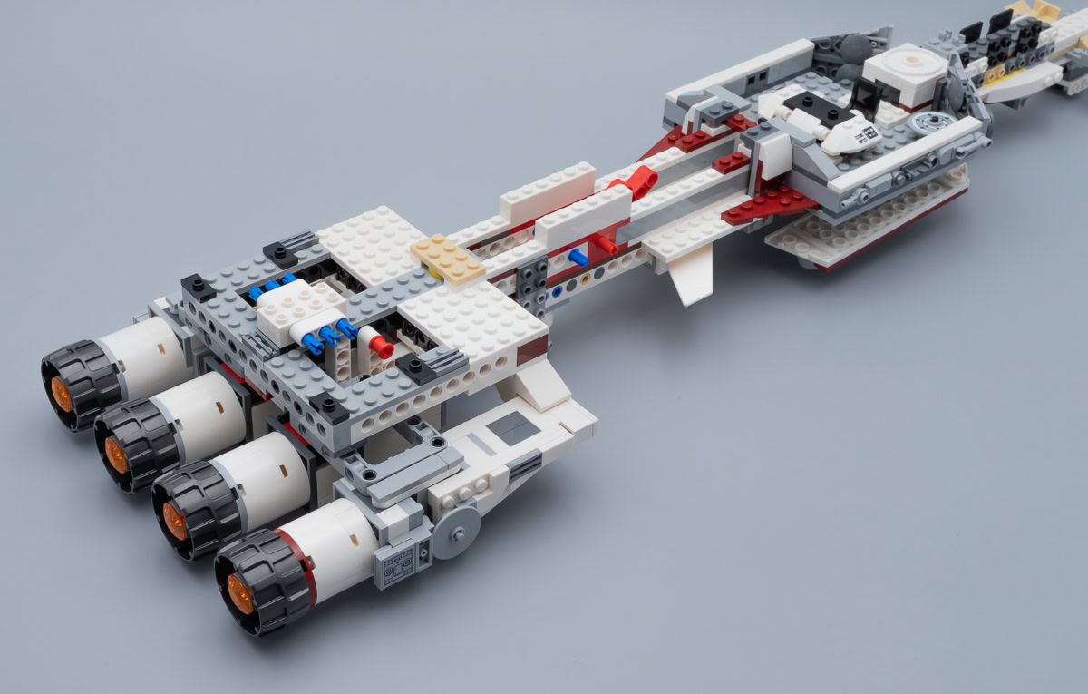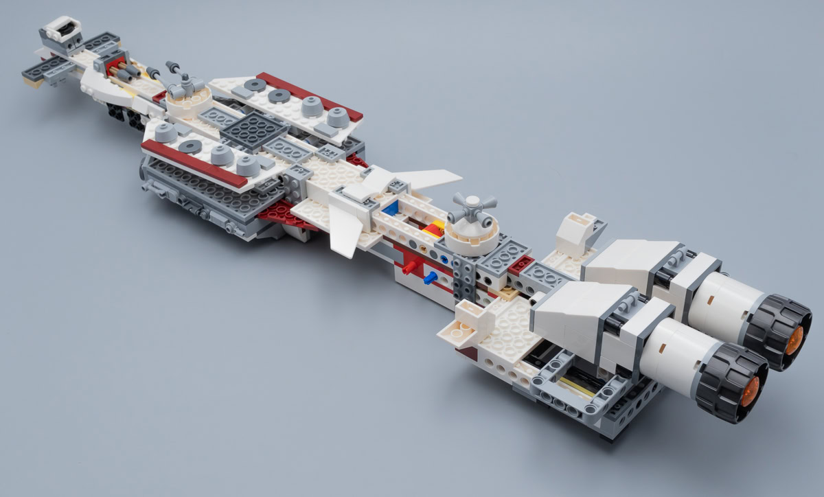 Pas de support de rangement et/ou d'exposition fourni par LEGO, le vaisseau repose sur ses moteurs et sur les différentes excroissances placées le long de la partie inférieure de la coque. C'est un peu dommage, quelques briques transparentes auraient été les bienvenues histoire de ranger correctement le playset sur une étagère entre deux séances de jeu.