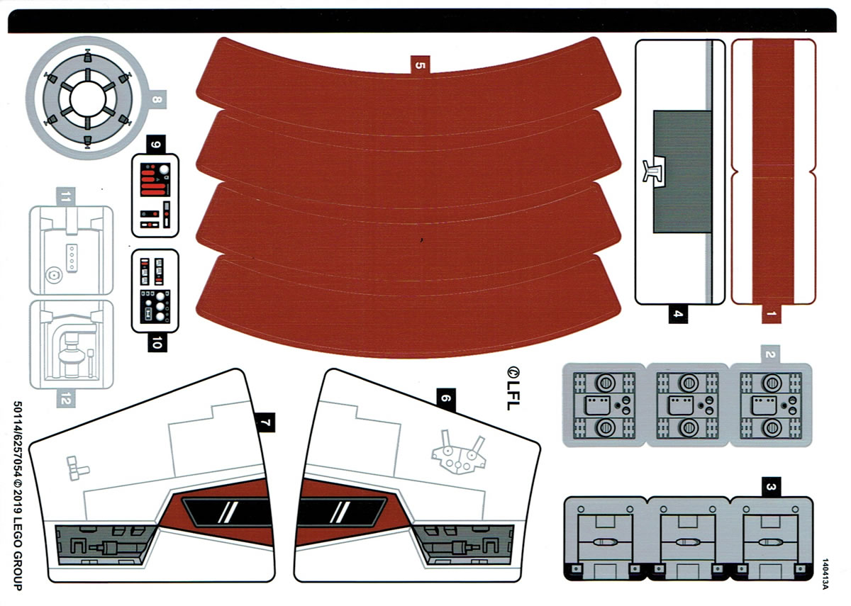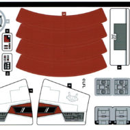 Je vous ai scanné la planche de stickers fournie (voir ci-dessous). Si les autocollants sont peu nombreux dans cette boite, l'application de certains d'entre sur des surfaces arrondies nécessitera de la patience et de la minutie. Rien à dire sur la présence sur le même modèle de pièces et de stickers en Dark Red, la cohérence de la teinte est quasi-parfaite. C'est moins évident pour les stickers sur fond blanc à poser sur des pièces qui elles ne sont pas d'un blanc immaculé. On remarque tout de suite l'écart de teinte sur les deux excroissances à l'avant du vaisseau.