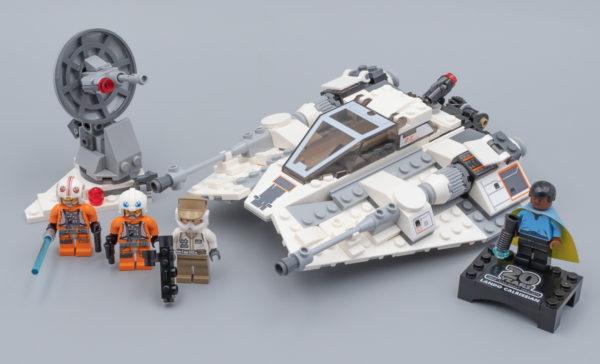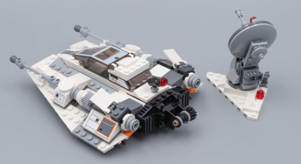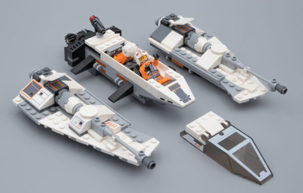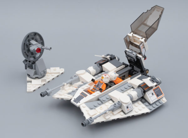 Pas de surprise durant la phase d'assemblage : on construit un Snowspeeder classique, plutôt réussi à cette échelle. Quelques stickers à coller et le tour est joué. Deux Spring-Shooters sont dissimulés sous les ailes de l'engin, c'est discret et ces accessoires qui apportent un peu de jouabilité ne défigurent pas la construction. C'est moins discret pour le Stud-Shooter placé à l'arrière.